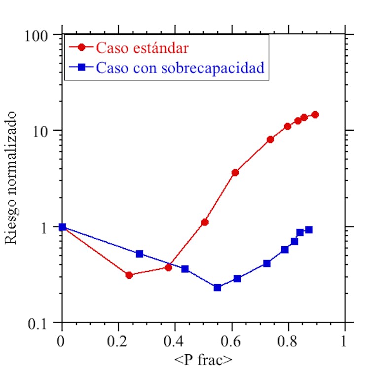 En un reciente estudio, hemos evaluado el riesgo de apagones en el sistema eléctrico balear al aumentar la penetración de renovables (energía solar fotovoltaica en este caso) y reducir la correspondiente capacidad convencional. Además, hemos considerado un almacenamiento equivalente a tres días de producción renovable. Así, hemos observado que el riesgo aumenta cuando el ratio de generación fotovoltaica supera el 40 % (caso estándar en la figura 1).