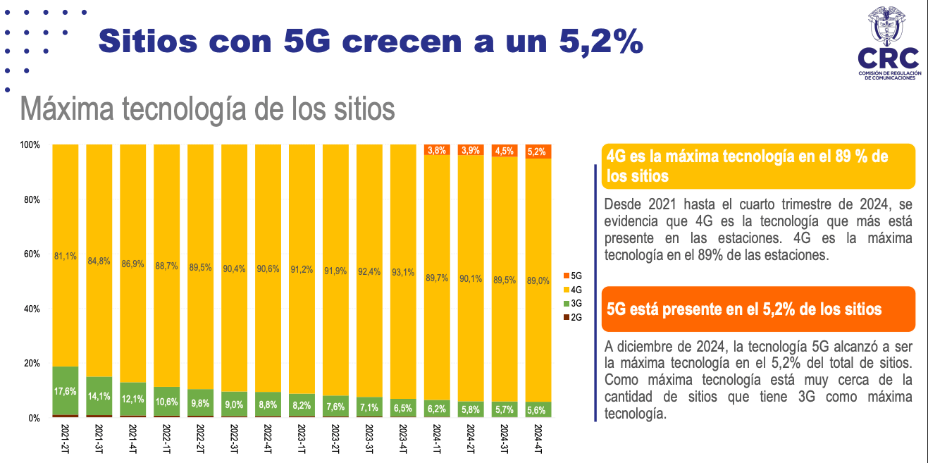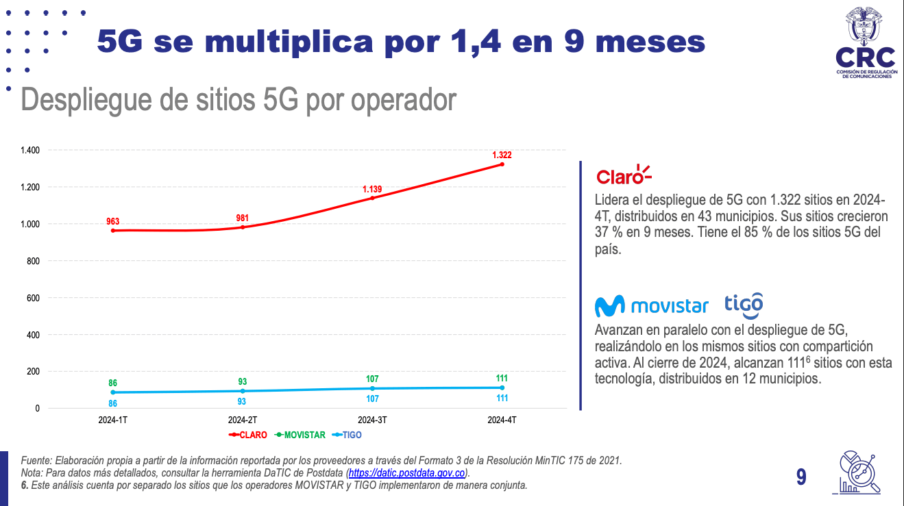 De acuerdo con la Comisión de Regulación de Comunicaciones, el despliegue de 5G, que comenzó en febrero de 2024, ya alcanza los 1.433 sitios activos en 43 ciudades y municipios, representando un avance en la modernización de las redes del país. Claro cuenta con un 92,2 % del total de dichos sitios, seguido por Tigo y Movistar con un 7,8 % de los sitios de acuerdo con el despliegue que de manera conjunta realizan estos últimos dos operadores. Por su parte WOM, con corte a diciembre de 2024, no reportó despliegue de sitios 5G.