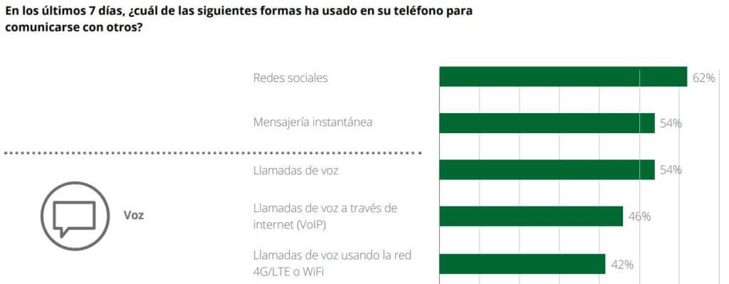 En términos de comunicaciones, el método más común de comunicación para el 62 % de la muestra de usuarios colombianos son las redes sociales, seguido por la mensajería instantánea con un 54 % y empatando con las llamadas por voz. Aunque pudiera pensarse que las llamadas vía Internet han cobrado más relevancia, lo cierto es que las llamadas por voz se mantienen como unos de los métodos de comunicación más usados por los colombianos.