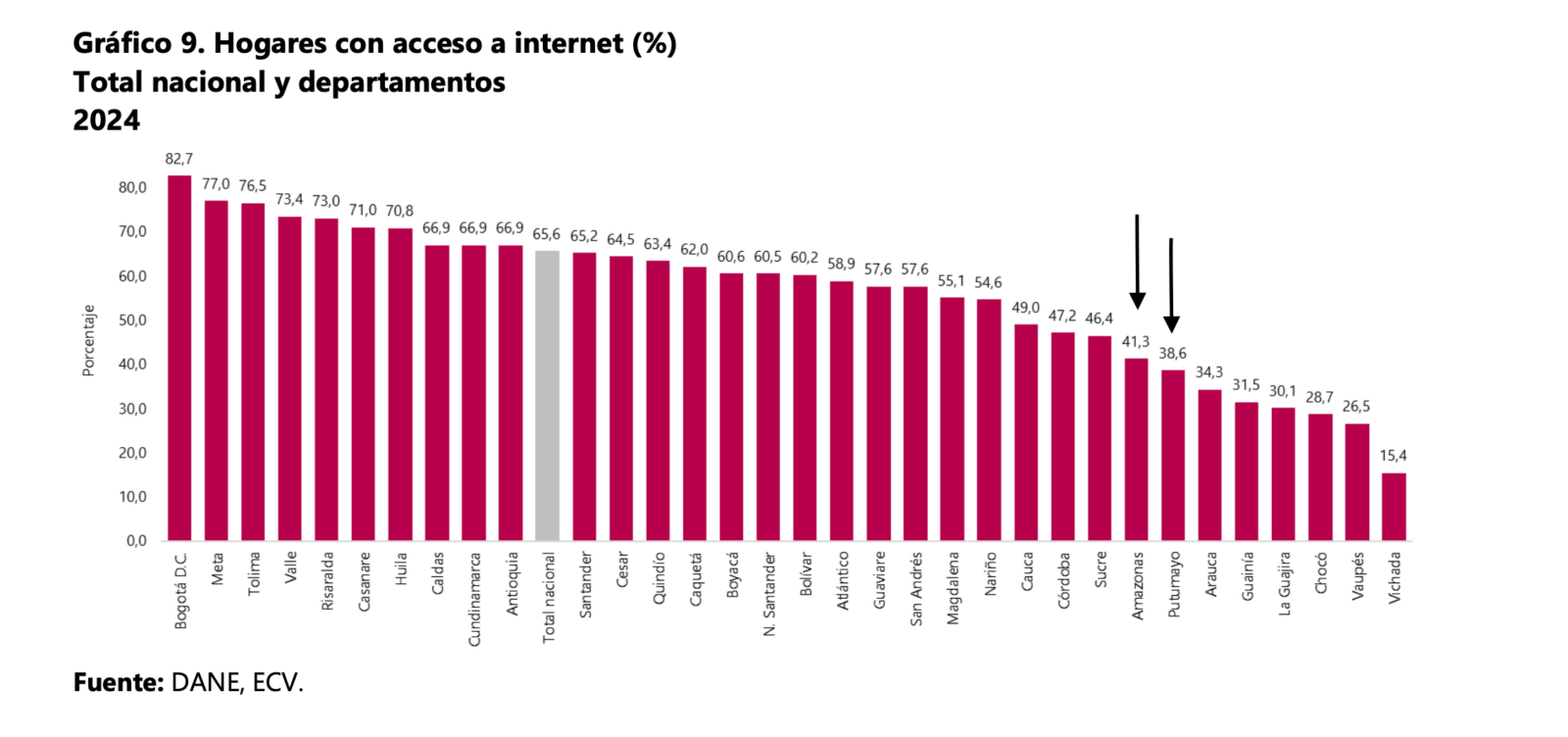 La región Amazonía-Orinoquía se mantiene como una de las zonas con mayores desafíos en infraestructura básica y digital de Colombia. La brecha digital es considerablemente alta, pues aunque la proporción de hogares con conexión a internet (fija o móvil) a nivel nacional alcanzó el 65.6 % en 2024, según la Encuesta Nacional de Calidad de Vida (ECV) de 2024 del Departamento Administrativo Nacional de Estadística (Dane). Los departamentos como Vichada y Vaupés (que forman parte de esta macrorregión) registran las proporciones más bajas, con niveles inferiores al 30.0 % de hogares conectados a internet.