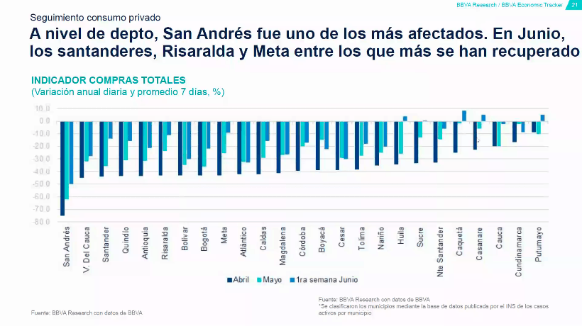 Por zonas de Colombia, Medellín y Bucaramanga han iniciado una recuperación en el gasto más temprana y registran una mejora sustancial en sus indicadores, mientras que Bogotá, Cali y Cartagena, donde aún se mantienen medidas de aislamiento más restrictivas que en el resto del país, muestran mayor rezago. El departamento de mayor afectación es San Andrés, teniendo en cuenta que su principal actividad económica es el turismo.