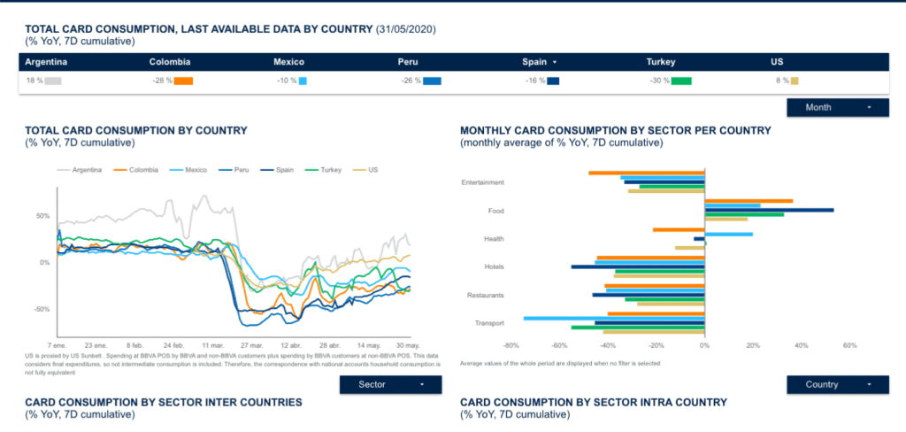 BBVA Economic Tracker está disponible en Internet para libre consulta y permite seleccionar diferentes parámetros. La plataforma es sencilla de usar y permite visualizar el contexto por regiones, tanto del mundo como locales; también se pueden hacer filtros de tiempo (fechas específicas).
