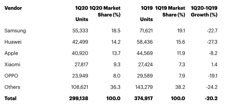 La firma consultora Gartner dio a conocer las cifras del mercado de smartphones en el mundo durante el primer trimestre de 2020, en el que las ventas se redujeron 20,2% con respecto al mismo periodo del año anterior. Solamente un fabricante, Xiaomi, tuvo un registro positivo, con 1,4 % de incremento en sus ventas, que equivale a 27,8 millones de unidades despachadas. Xiaomi sigue siendo el cuarto vendedor en el mundo, con 9,3 % de participación del mercado, y el tercero en Colombia.