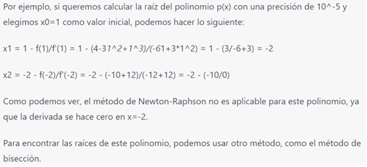 Si preguntamos por las raíces de un polinomio de grado 3, en este caso todas reales, ChatGPT nos argumenta que la resolución analítica puede complicarse dependiendo del polinomio propuesto, así que nos recomienda utilizar un método numérico iteractivo como el Método de Newton-Raphson.
