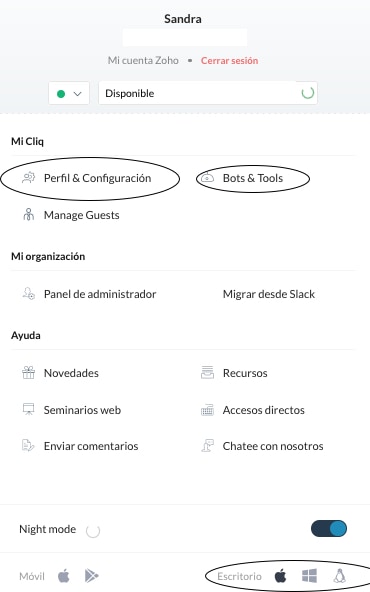 El primer paso es conocer la aplicación: están las conversaciones grupales, canales, contactos de la empresa, widgets y los bots. El paso inicial será personalizar su aplicación, y aquí se encuentran aspectos como el perfil, la apariencia de la aplicación, el menú principal (el orden que desea), hasta si desea deshabilitar la opción de chat desde otras aplicaciones de Zoho, qué notificaciones desea, los estados que va a manejar y la privacidad. Dentro de Cliq, en la parte superior derecha, al hacer clic o tocar donde está la foto de usuario, se desplegará el menú principal para acceder a las configuraciones, perfil y herramientas.