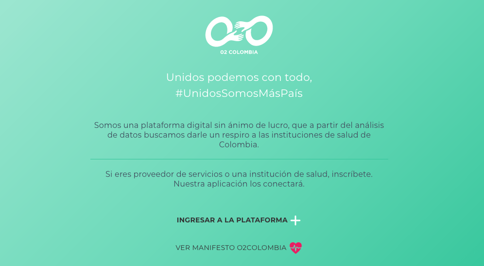 La plataforma O2 Colombia nació del concurso Idata, de la Andi, la Fundación Anadi, RutaN, Microsoft y un equipo de desarrolladores y emprendedores para enfrentar el desabastecimiento de insumos médicos durante la pandemia del COVID-19, estableciendo más de 135 insumos y las cantidades que de ellos se requieren para la atención de cada caso de COVID-19 en un hospital.