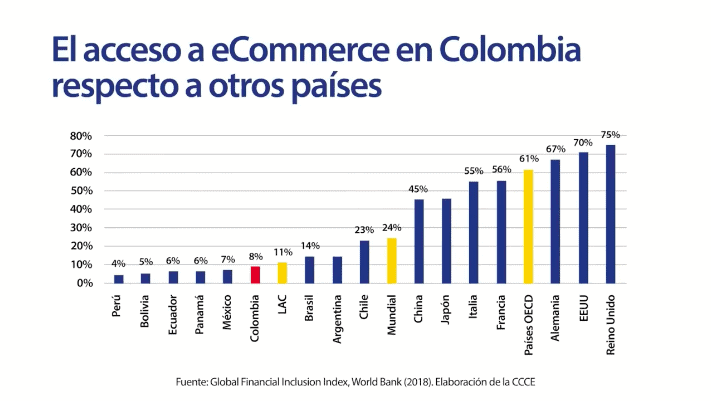 En Latinoamérica solo el 11 % de la población usa comercio electrónico, y en Colombia solo se usa en un 8 %. Por otro lado, este tipo de comercio aún se concentra en los estratos sociales más privilegiados, según compartió Quiñones. Las personas que realizan compras en línea ganan más de 3 salarios mínimos y están en zonas de mayor densidad de población, “el comercio electrónico aún no ha permeado lo intercambios cotidianos de las personas, lo cual es el objetivo”, agregó.